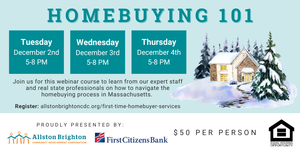 Allston Brighton CDC is partnering with First Citizens Bank to hold a virtual Homebuying 101 class on the following dates: