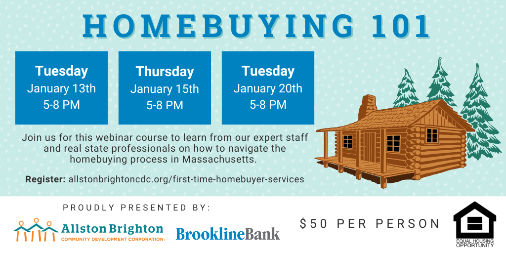$50Allston Brighton CDC is partnering with Brookline Bank to hold a virtual Homebuying 101 class on the following dates: