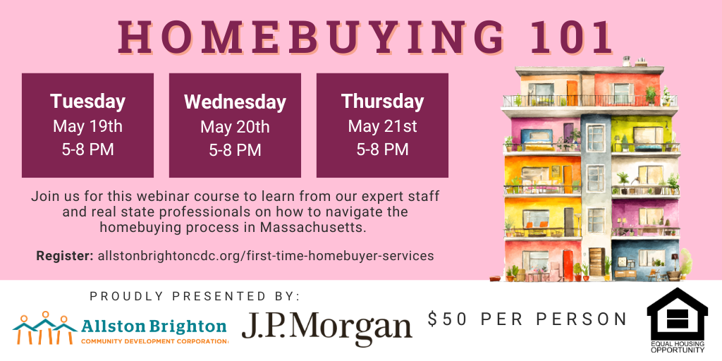 Allston Brighton CDC is partnering with J.P. Morgan Chase to hold a virtual Homebuying 101 class on the following dates: