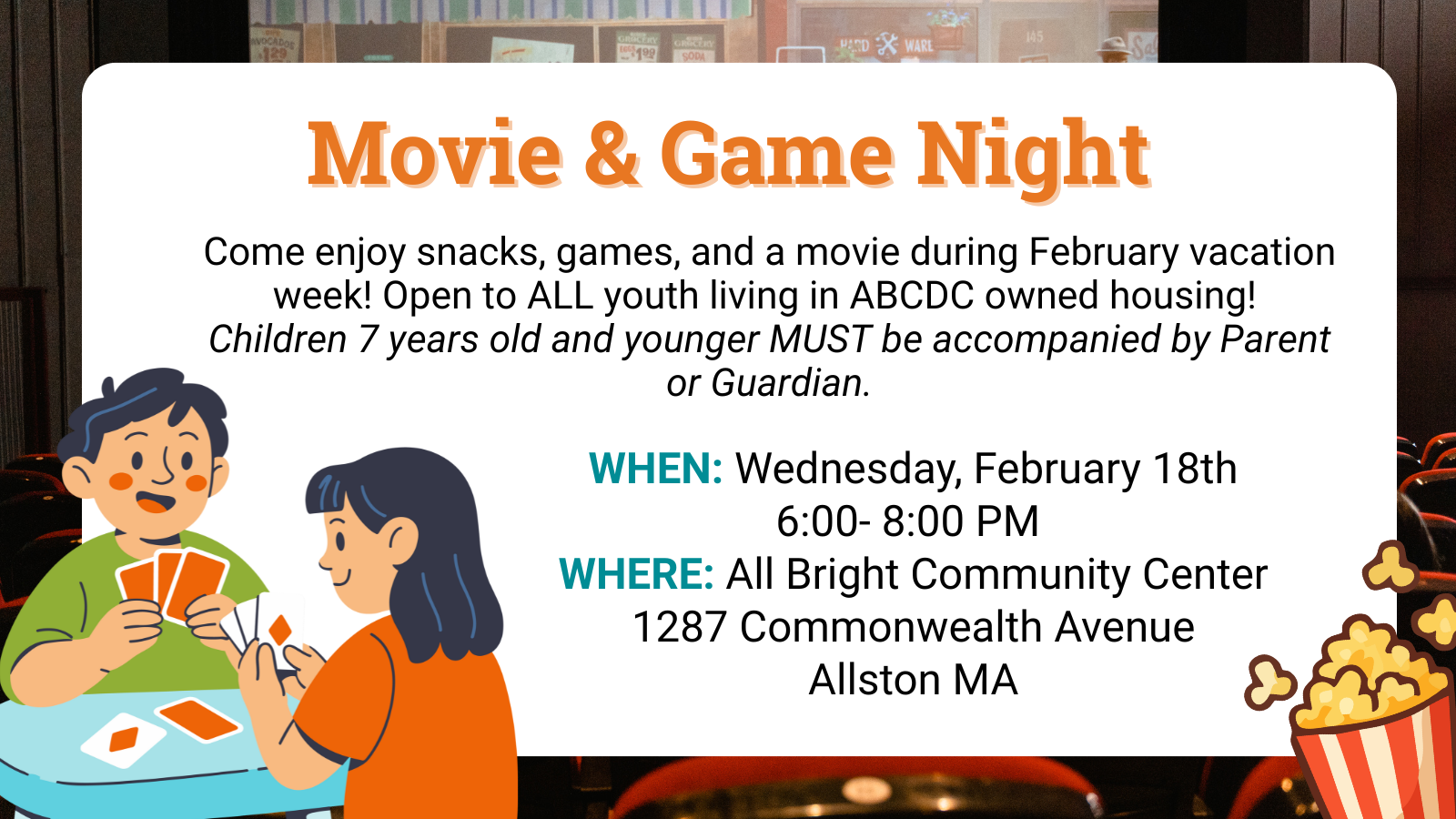 « All Events Movie & Game Night (February 18, 2026) February 18 @ 6:00 pm - 8:00 pm Free « Resident Coffee Hour (February 18, 2026) Resident Coffee Hour (February 25, 2026) » *This event is for ABCDC residents only Events at the All Bright Community Center/ Eventos en el Centro Comunitario All-Bright Are you a resident in one of Allston Brighton CDC's properties? Register today for one of the upcoming activities at the All Bright Community Center.Check out the full event calendar here!¿Reside usted en una de las propiedades de Allston Brighton CDC? Regístrese hoy mismo para participar en una de las próximas actividades del Centro Comunitario All Bright.¡Consulta el calendario completo de eventos aquí! First Name/ Nombre Last Name/Apellido Email/ Correo Electronico What event are you registering for?/ Para que tipo de evento se estas registrando?Please select... Weaving Class (February 2nd) Coffee Hour - Classic Songs (February 4th) Black History Month Celebration (February 9th) Movie/Game Night (February 18th) What building do you live in?/En que edificio vive? Please select... Ashford Street Brian J. Honan Apartments Brighton Allston Apartments Carol Avenue Apartments Commonwealth Apartments Glenville Apartments Hano Homes Long Glen Rental II Ray Dooley Apartments The William (Bill) E. McGonagle Recovery House Warren Hall How many people are attending? Please include yourself/ Cuantas personas saran partcipando en el evento? Por favor de incluirse usted mismo Please select... 1 2 3 4 5+ Contact Information Add to calendar Google Calendar iCalendar Outlook 365 Outlook Live Details Date: February 18 Time: 6:00 pm - 8:00 pm Cost: Free Event Categories: ABCDC Residents Only, All Bright Community Center Venue All Bright Community Center 1287 Commonwealth Avenue Allston, MA 02134 United States + Google Map