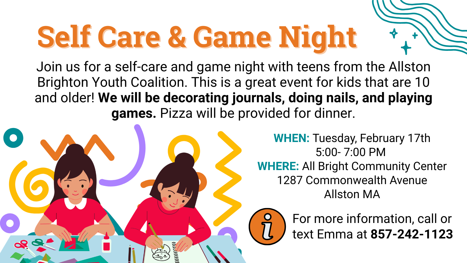 On Tuesday, February 17, ABCDC will be hosting a self-care and game night with teens from the Allston Brighton Youth Coalition. This is a great event for kids that are 10 and older! We will be decorating journals, doing nails, and playing games. This event will take place from 5-7pm at the All Bright Community Center, and pizza will be provided for dinner.