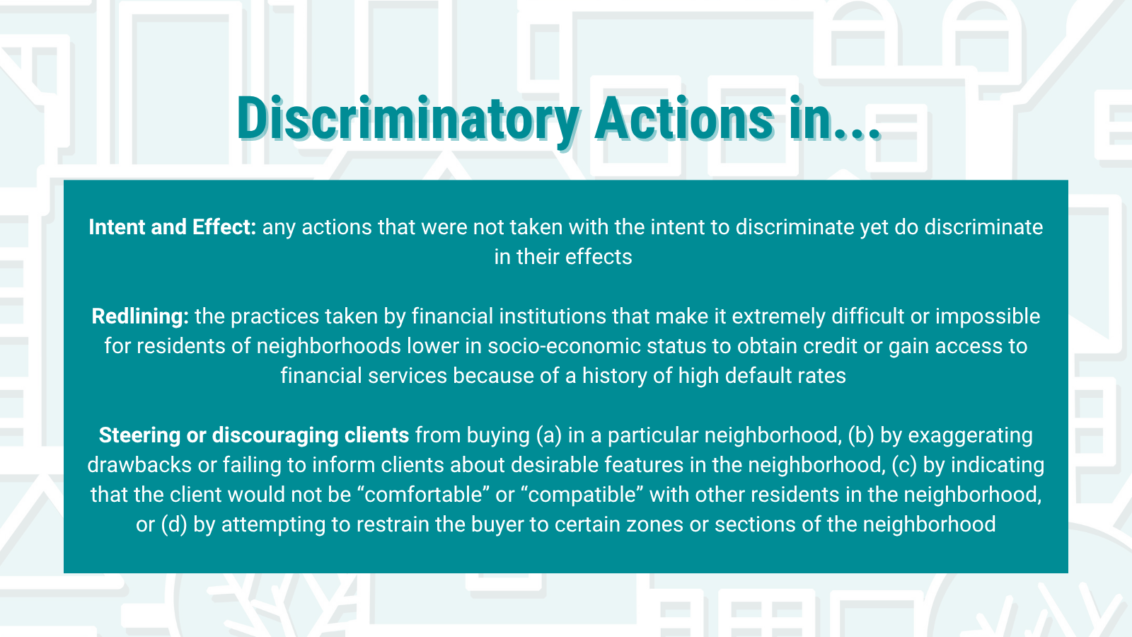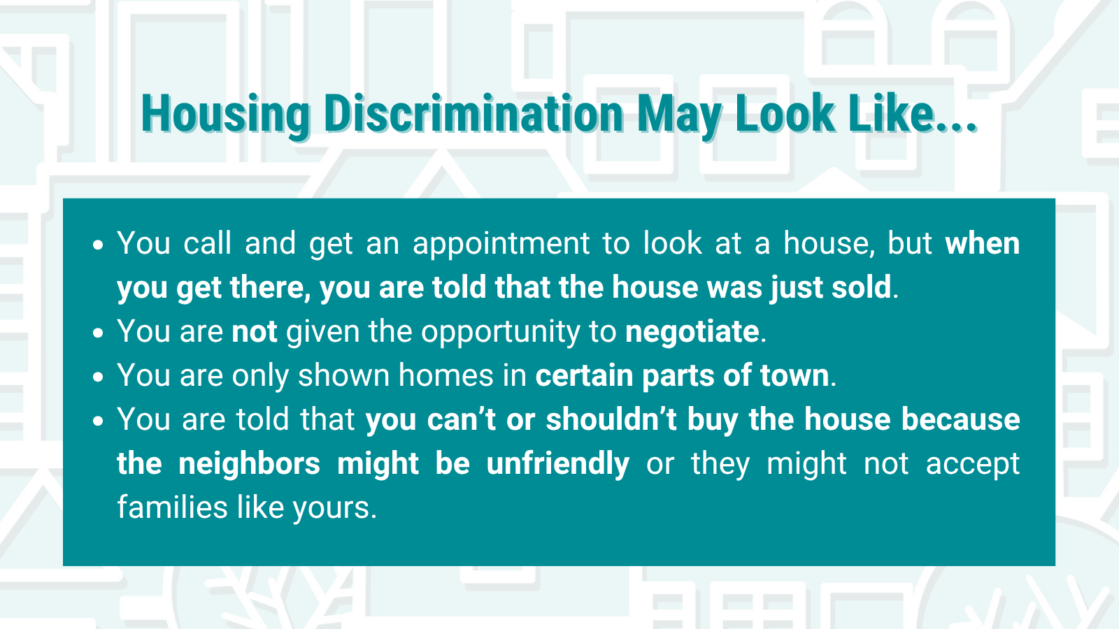 Even when illegal discriminatory actions are not intentional, they are still illegal. If a landlord or seller offers options to one applicant and not to another based on their membership in a protected class, it is illegal discrimination. If someone makes assumptions about potential tenants or clients – about their ability to pay, about their likelihood of being “good” clients, about their potential for causing problems – based on their race, disability, accent, family size, etc. – that is illegal discrimination.