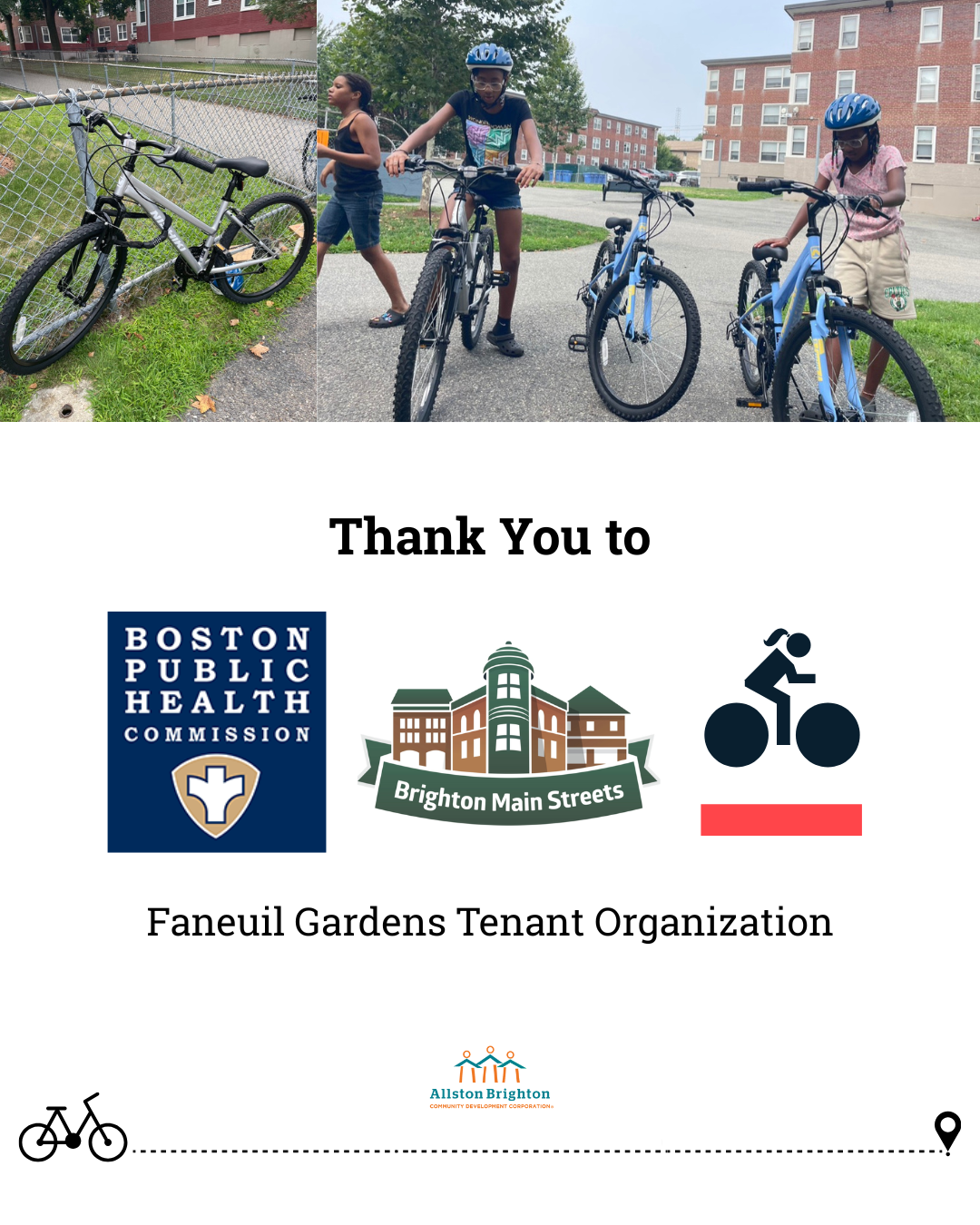 After getting approval from the board, BMS purchased brand new bikes from Dick’s Sporting Goods for the nine youth in BFF programming who needed a bike. George Martin, secretary of the Faneuil Gardens Tenant Organization, helped Emma put all 9 bikes together. Without his knowledge, tools, and time, the process would have taken much longer and we couldn’t have done this without his help.